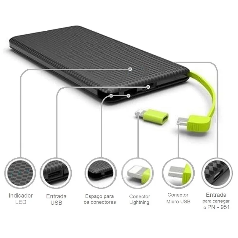 • Tecnologia pass through charging, pode carregar seus dispositivos e ser recarregado ao mesmo tempo